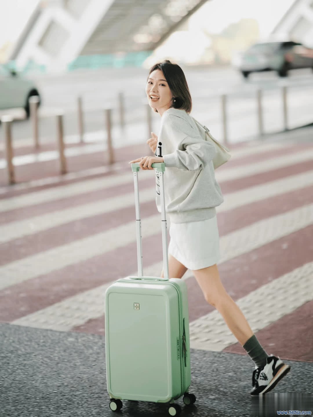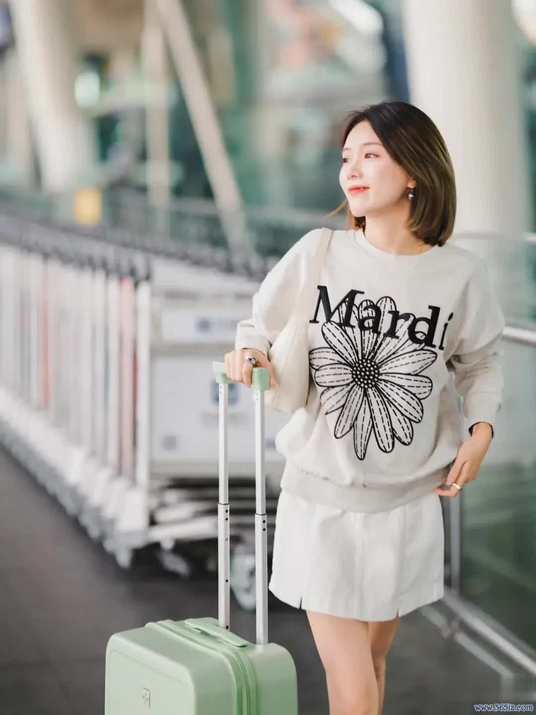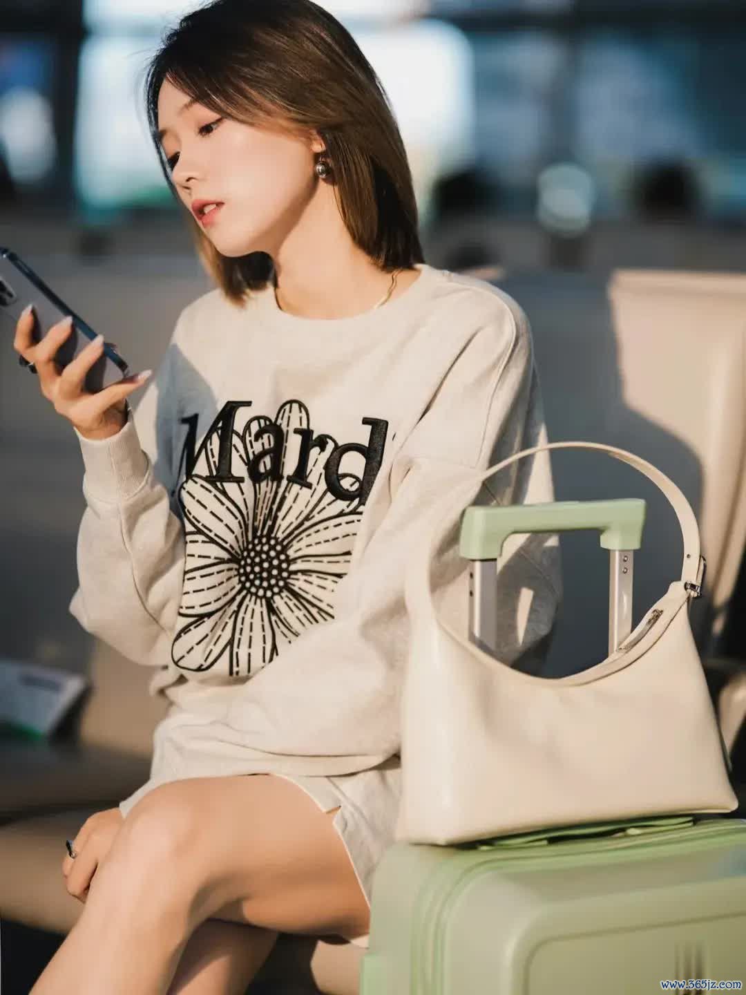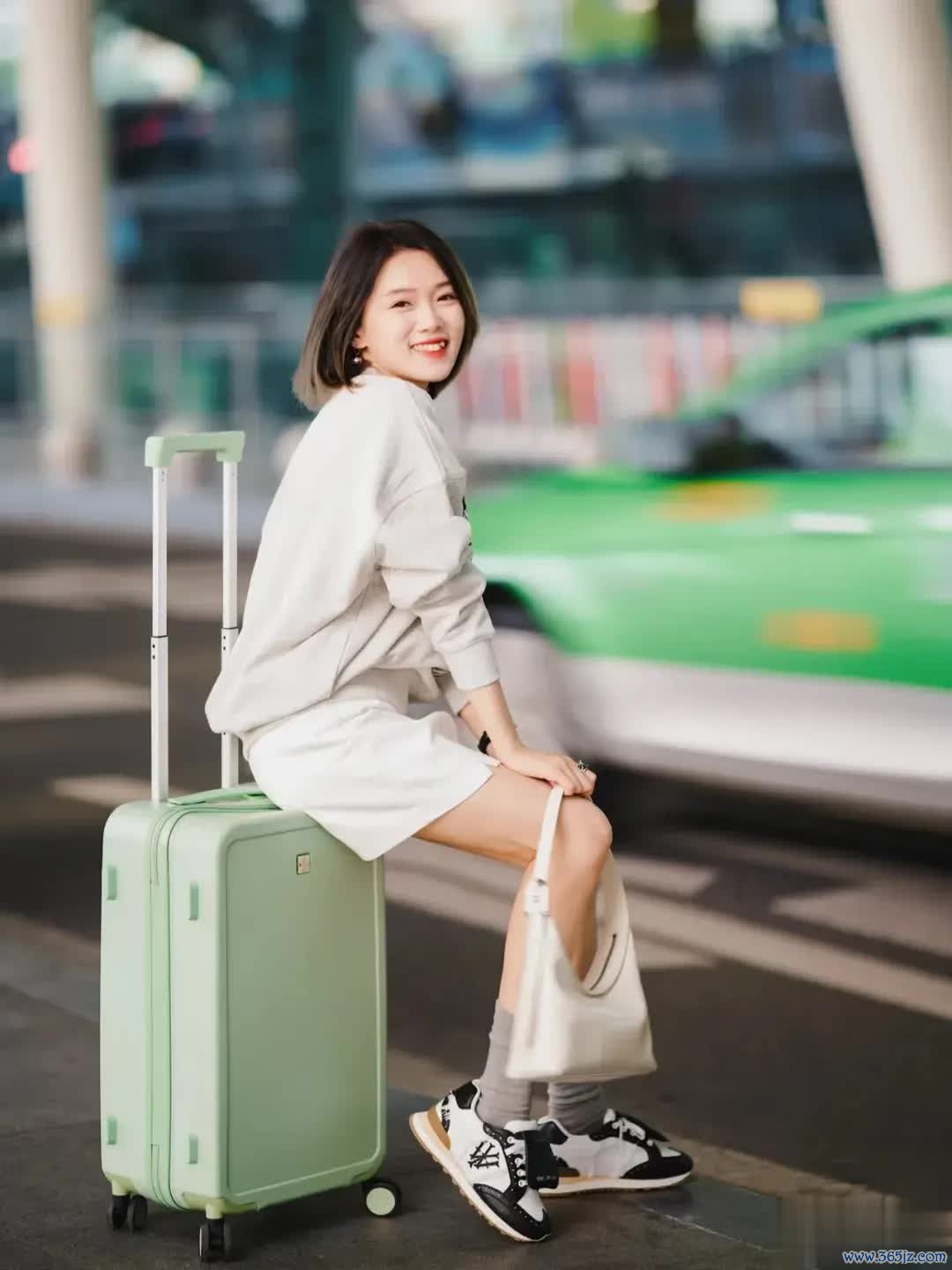 咱们不错在马路边拍一张,将行李箱立在身旁,身段轻轻依靠,往后仰同期总结含笑看向镜头。头发当然垂落,泄气出一种慵懒与随心的路径气味。虚化配景,展现东说念主物亮堂通透的皮肤,显白又显瘦,简陋而高档。