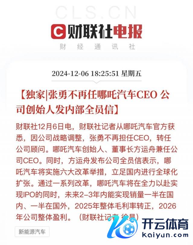 在这些音讯的影响下,也使得哪吒汽车的销量抓续走低。官方从 10 月运行,也不再对外公布最新的销量了。与此同期,为了在浓烈的竞争中存活下来,哪吒汽车在前年 12 月进行东说念主事大变动。原哪吒汽车 CEO 张勇不再担任 CEO 一职,转为公司参谋人,哪吒汽车创举东说念主方运舟兼任公司 CEO,走向台前躬行掌舵公司更正。在方运舟担任哪吒汽车 CEO 后,发布了一份里面信,信中其指出哪吒汽车将实施六大更正举措,存身国内进行全球化彭胀。通过一系列更正,哪吒汽车将在任重道远驱散 IPO 的同期,改日 2-3 年内能驱散销量一半在国内、一半在国外,2025 年全体毛利率转正,2026 年公司全体盈利。