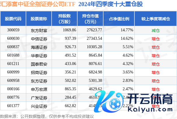 汇添富中证全指证券公司ETF为指数型-股票基金,把柄最新一期基金季报理解,该基金金钱建树:股票占净值比99.6%,无债券类金钱,现款占净值比0.51%。基金十大重仓股如下:
