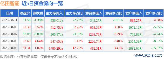 8月11日的资金流向数据方面,主力资金净流出536.01万元,占总成交额2.77%,游资资金净流出349.27万元,占总成交额1.81%,散户资金净流入885.27万元,占总成交额4.58%。