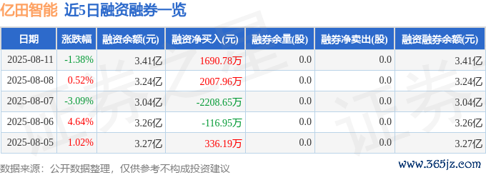 亿田智能融资融券信息流露,融资方面,当日融资买入3221.37万元,融资偿还1530.58万元,融资净买入1690.78万元。融券方面,融券卖出0.0股,融券偿还0.0股,融券余量0.0股,融券余额0.0万元。融资融券余额3.41亿元。