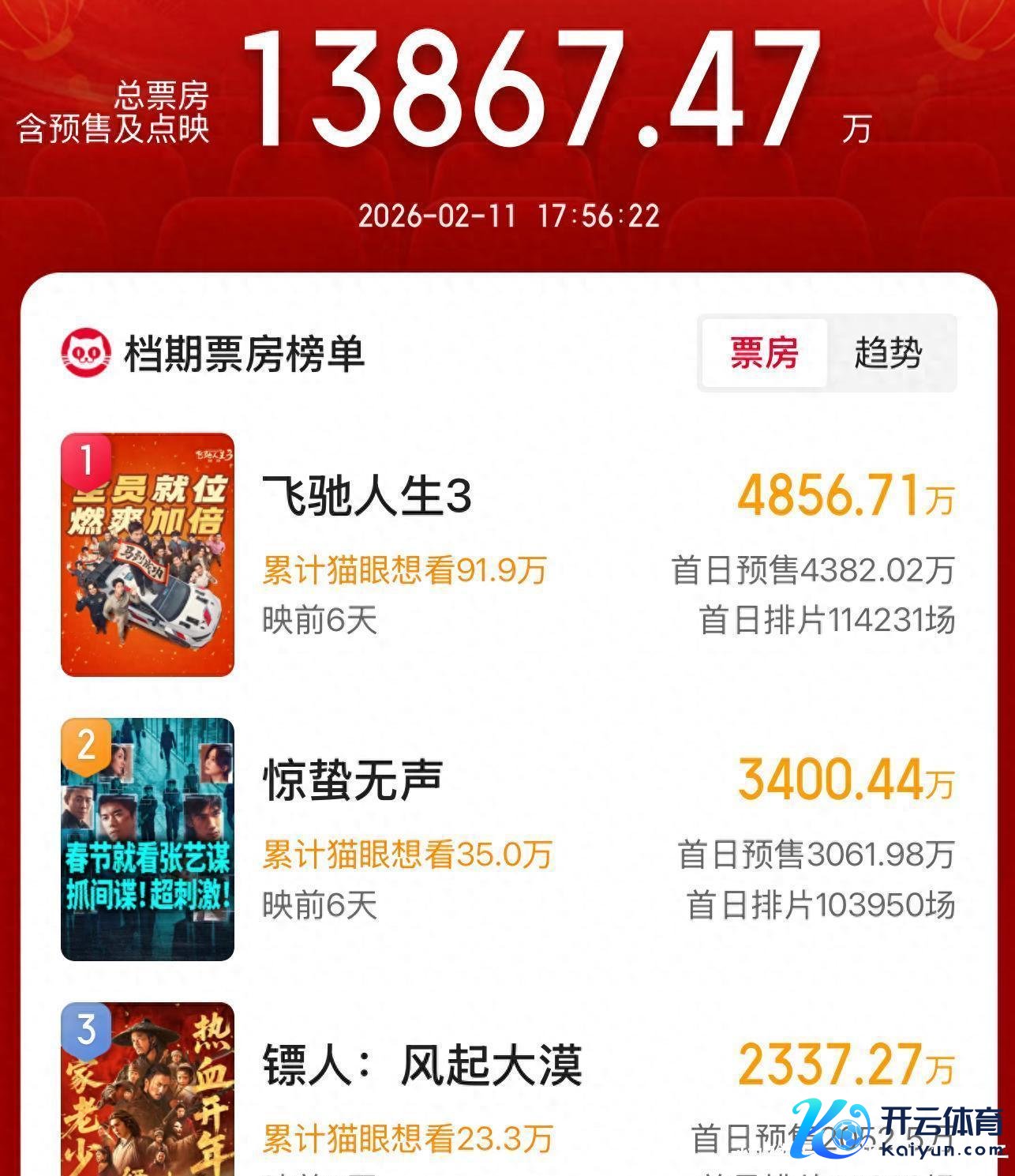 春节档还没认真开打,炸药味如故完竣!预售刚开启不久,大盘就突破了1.4亿大关kaiyun网站,沈腾的《奔驰东说念主生3》一马动身点,把近5000万的票房收入囊中,把易烊千玺的《惊蛰无声》和吴京的《镖东说念主:风起大漠》甩在了死后。