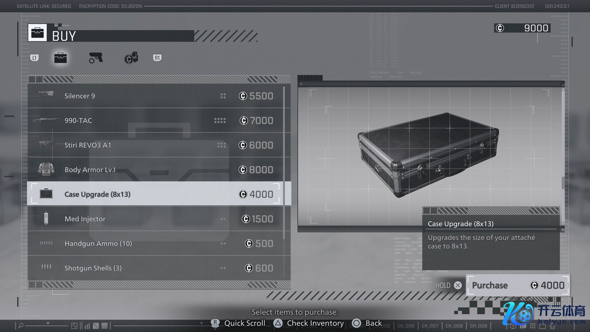 要升级里昂的物品栏,你必须在补给箱处购买手提箱升级。只须一个升级能将其物品栏扩大到 8x13,破耗 4,000 信用点。该升级仅在你到达浣熊市章节后才会开启。
