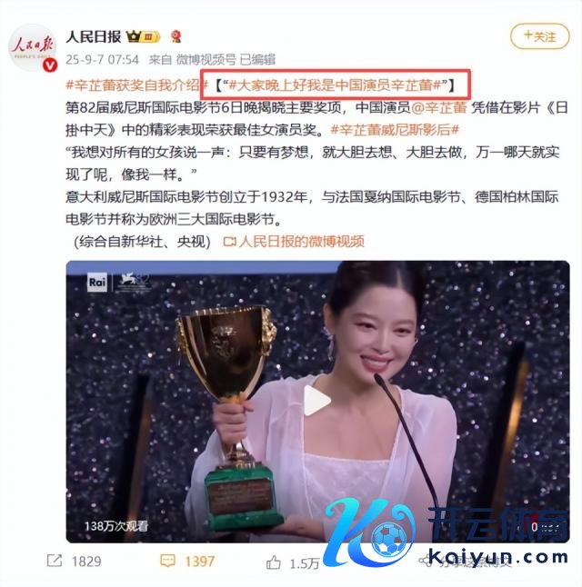 辛芷蕾能让东说念主民日报点赞,不是因为她站在了国外领奖台的 C 位,而是因为她用"中国演员"的身份,带着述品为华语影视争脸。