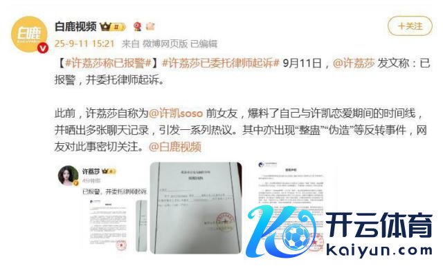 一纸讼师声明加上向阳警方的接报回握,让演员许凯前女友许荔莎与网友的"汇聚大战"透顶投入了国法对决阶段。9 月 11 日,许荔莎通过微博公开报案材料,指控网民陆某(微博 ID " xixisoso0707 ")坏心伪造聊天记载、挑动汇聚暴力开云官方,并清楚将同步细致参与伪造把柄的"某女明星及未成年东谈主"包袱——这场从八卦爆料升级为报假警、伪证罪的纠纷,已演变成 2025 年内娱最扑朔迷离的罗生门。