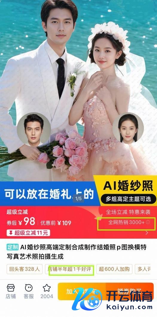 记者在某电商平台搜索“AI婚纱照”,联系店铺有上千家。一家销量排行靠前的店铺客服先容:提供几张了了正脸照,挑选作风、制作小样阐发同样度后恭候生成,作风遮掩登第、韩式、欧式、旅拍等上百种,价钱从几十元到1000多元不等,时常几小时最多两三天即可托福。该店20张套餐用度为1180元,全网热销3000多单。
